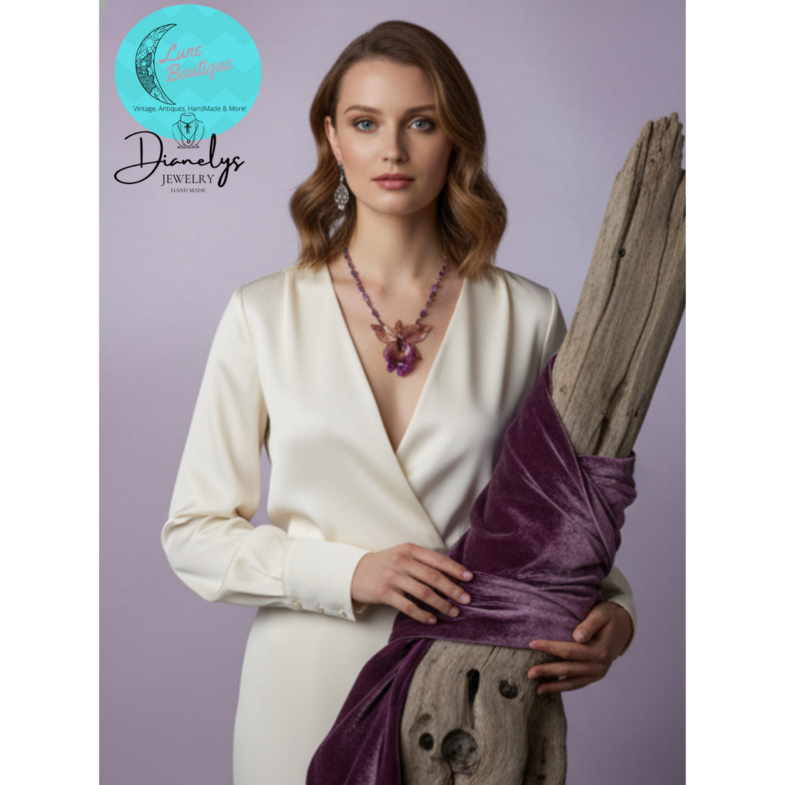 Purple Ocrhid Neckace with Purple Iredescent Beads Handmade Only 1